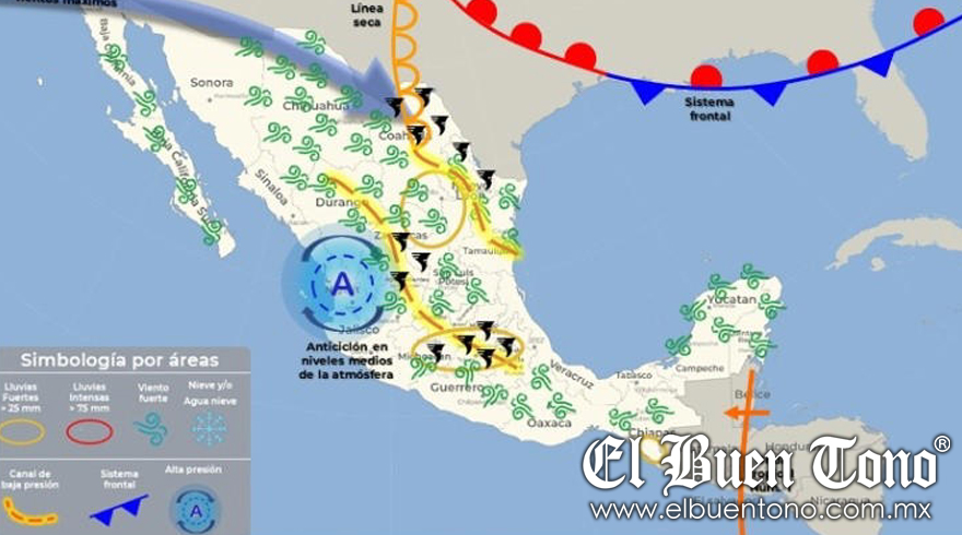 La combinación de canales de baja presión, una línea seca, inestabilidad en niveles altos de la atmósfera e ingreso de humedad de ambos litorales, generará condiciones propicias para tornados y fuertes vientos. Coahuila, Nuevo León y Tamaulipas podrían enfrentar rachas de viento de 60 a 80 km/h, con posible formación de tornados. Adicionalmente, se prevén fuertes vientos en Zacatecas, San Luis Potosí, Aguascalientes, Michoacán, Hidalgo, Estado de México, Ciudad de México, Tlaxcala y Puebla.
