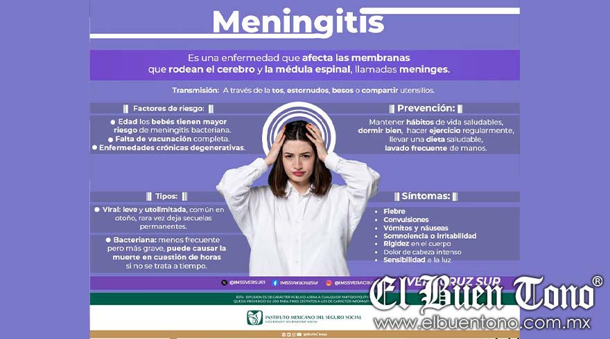 Córdoba.- El Instituto Mexicano del Seguro Social (IMSS) en Veracruz Sur informa a la población general sobre la meningitis, enfermedad considerada altamente peligrosa para los niños, la cual de no tratarse a tiempo puede causar graves problemas a la salud, discapacidad y hasta la muerte.