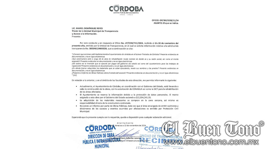 Mediante una solicitud de acceso a la información, se logró conocer que las labores son coordinadas por el ayuntamiento de Córdoba, la Comisión Nacional del Agua (Conagua), la Secretaría de Infraestructura, Comunicaciones y Transportes (SICT) y el gobierno estatal. Sin embargo, persiste la falta de datos específicos sobre la empresa contratada para la ejecución del proyecto.