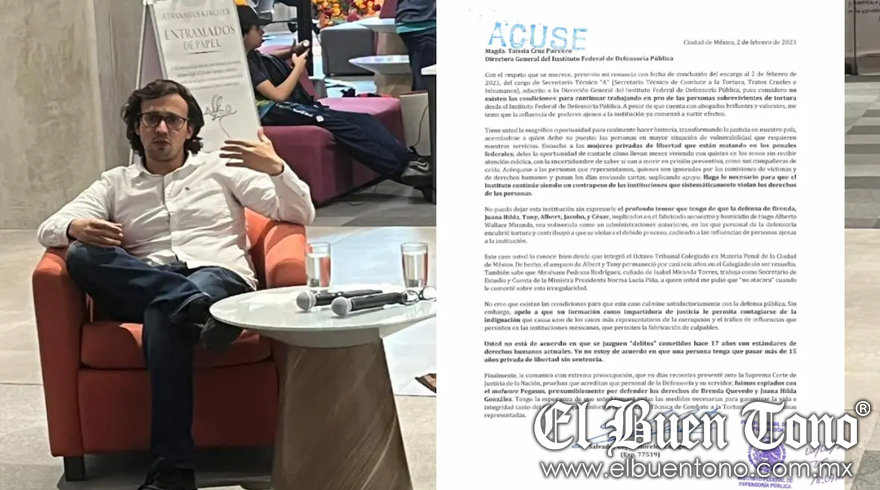 CDMX.- El secretario Técnico de Combate a la Tortura del Instituto Federal de la Defensoría Pública (IFDP), Salvador Leyva Morelos Zaragoza, presentó su renuncia al cargo tras denunciar que fue víctima de espionaje con Pegasus y acusar que existe influencia de “poderes ajenos” a la institución.