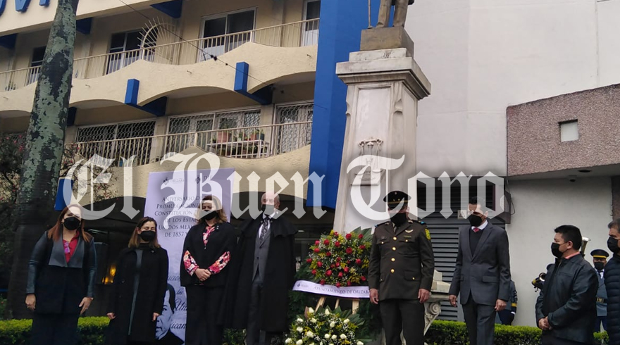 Orizaba.- A los pies del monumento de Benito Juárez ubicado en la Poniente 7 se realiza el evento del aniversario de la promulgación de la Constitución Política de los Estados Unidos Mexicanos de 1857 y 1917, se encuentran presentes autoridades municipales, educativas, del ejército mexicano y de las logias masónicas.