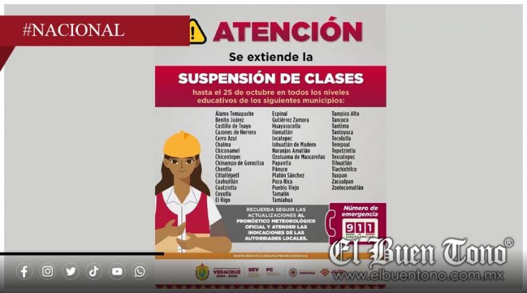 Xalapa, Veracruz, 18 de octubre de 2025.– A diez días de las intensas lluvias que afectaron gran parte del norte del estado y dejaron 40 municipios en zona de desastre, la Secretaría de Protección Civil de Veracruz, en coordinación con el Comité Estatal de Emergencias y la Secretaría de Educación de Veracruz, ha determinado extender la suspensión de clases y actividades escolares hasta el sábado 25 de octubre de 2025.