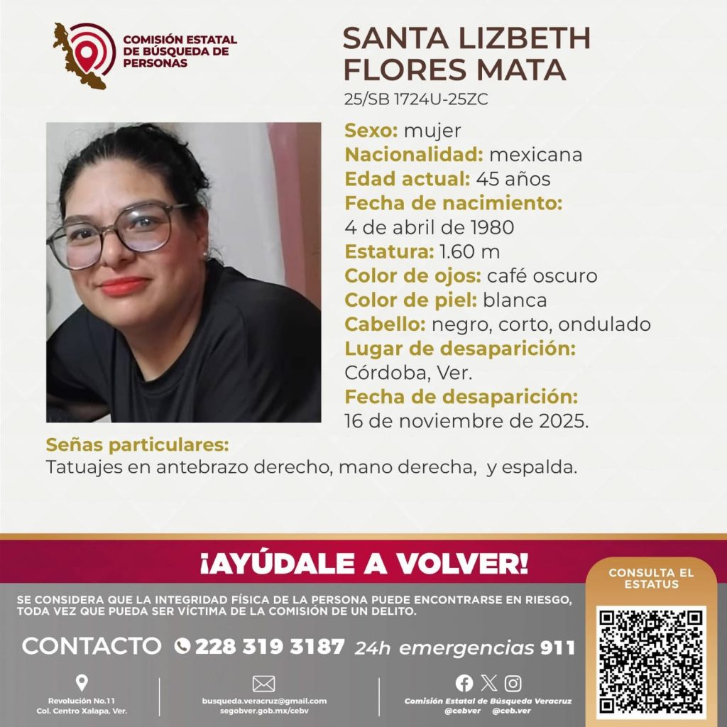 Córdoba, Ver.- Santa Lizbeth Flores Mata, de 45 años, permanece desaparecida desde el pasado 10 de noviembre. Su familia solicita el apoyo de las autoridades y de la ciudadanía para localizarla sana y salva, pues existe la posibilidad de que sea víctima de un delito.