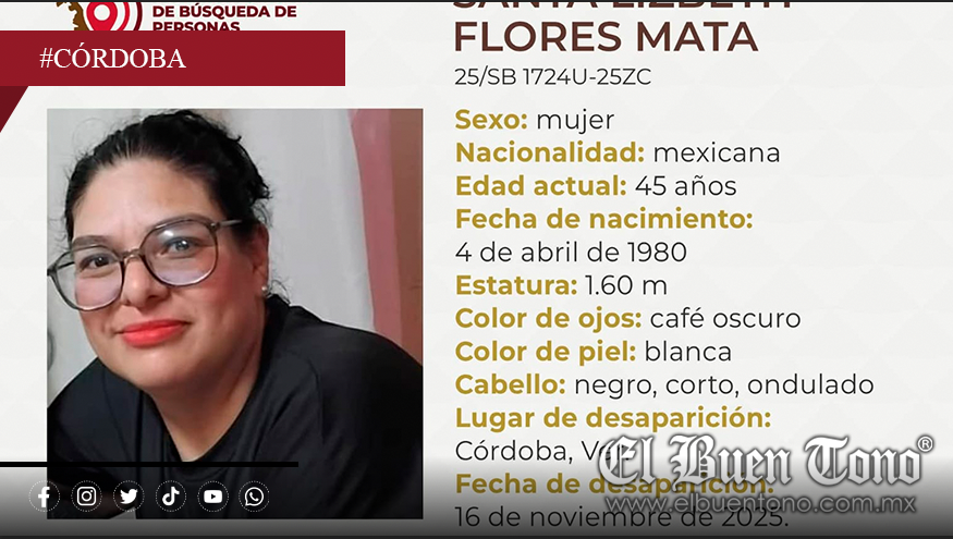 Córdoba, Ver.- Santa Lizbeth Flores Mata, de 45 años, permanece desaparecida desde el pasado 10 de noviembre. Su familia solicita el apoyo de las autoridades y de la ciudadanía para localizarla sana y salva, pues existe la posibilidad de que sea víctima de un delito.