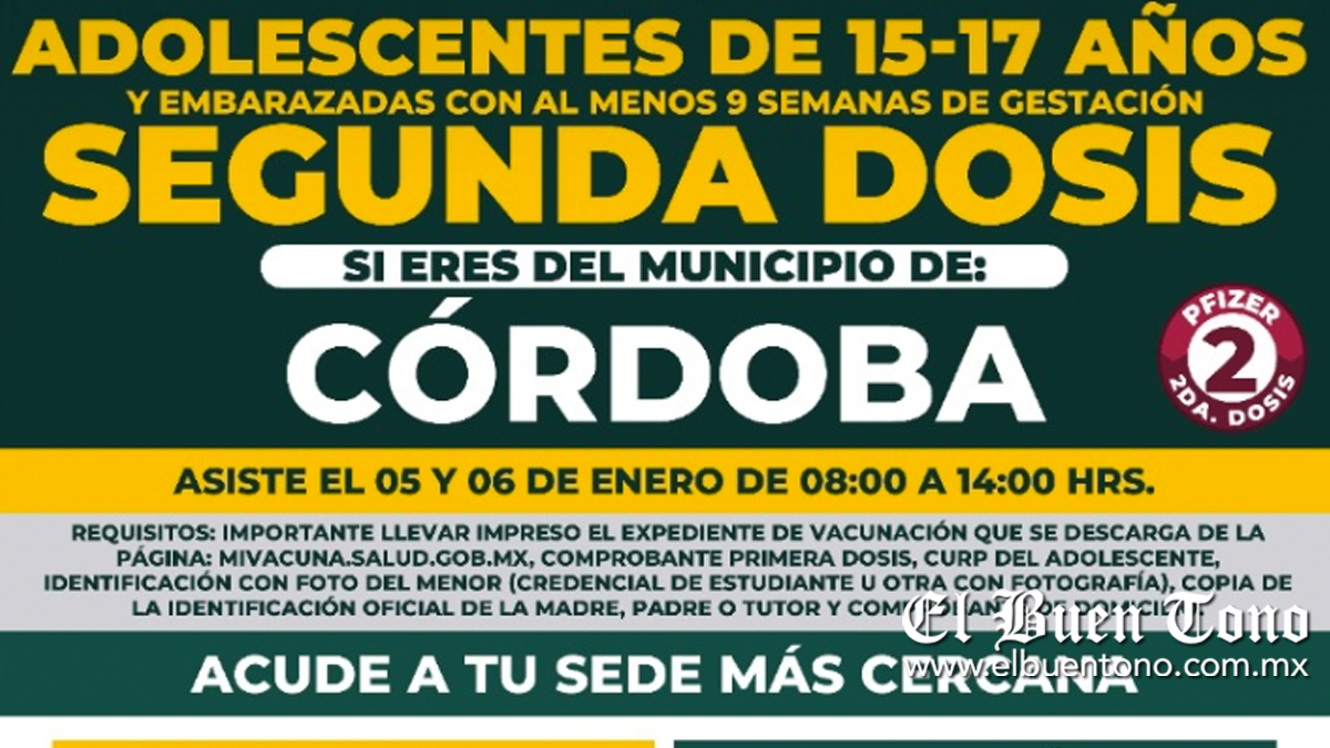 CÓRDOBA.- La Secretaría de Bienestar publicó la convocatoria para la jornada de vacunación de la segunda dosis anticovid para adolescentes de 15 a 17 años de edad así como a embarazadas con al menos 9 semanas de gestación y para el sector poblacional en situación de rezago los días 5 y 6 de enero. Las sedes serán la Arena Córdoba ubicada en la calle 6 de la colonia San Francisco Toxpan y en el El Bajío, domicilio conocido en las instalaciones de la Secundaria Tierra y Libertad.