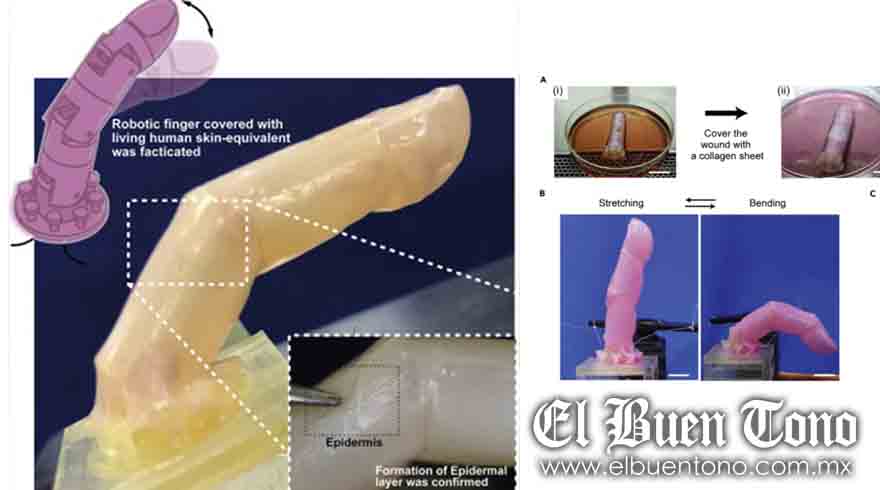 Piel humana viva creada para los robots por científicos japoneses no sólo ha dado a un dedo robótico una textura parecida a la de la piel, sino también funciones de repelencia al agua y autocuración.