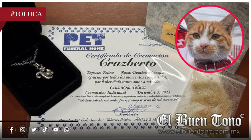 Toluca.- La Delegación de la Cruz Roja Mexicana en Toluca despidió con profundo pesar a Cruzberto, el pequeño gatito que se convirtió en símbolo de compañía, empatía y cariño dentro de la institución, luego de que perdiera la vida este miércoles tras ser atropellado por un conductor imprudente en las inmediaciones de la zona de hospitales.