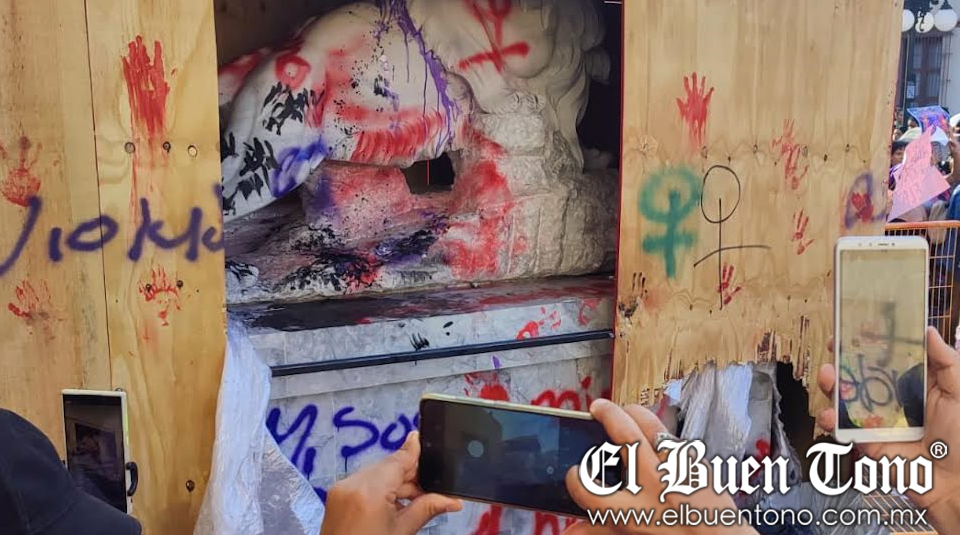 Y es que, pese a sus fallidos intentos de proteger sus monumentos, por la tarde lograron derribar los tablones de madera hasta pintar las esculturas como señal de molestia con leyendas como “Misógino”, “Diez Feminicida”.