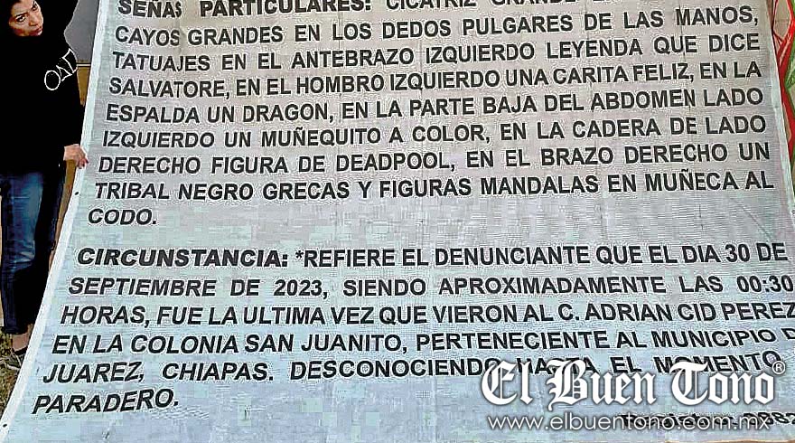 “El día 30 de septiembre de 2023, a las 03:00 horas, fue la última vez que vieron a Adrián Cid Pérez en la colonia San Juanito de Juárez, Chiapas, desconociendo hasta el momento su paradero”. Se alcanzó a leer en una manta que fue colocada en una de las bardas de la fábrica textil.