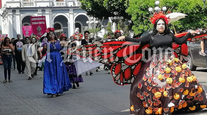 Alumnos de diversas licenciaturas e ingenierías de la Universidad Popular Autónoma de Veracruz (UPAV) sede Centro de Seguridad salen a las principales calles de la ciudad personificando a la muerte con tradicionales trajes de catrinas y catrines.