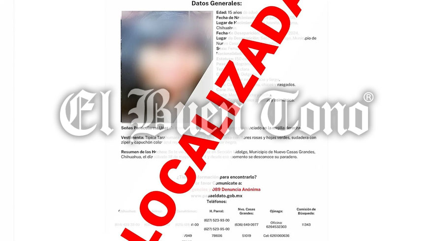 Nuevo Casas Grandes.- La angustia de casi una semana ha llegado a su fin con la noticia de que la menor de edad de la etnia rarámuri, que se había reportado como desaparecida en Sección Hidalgo, ha sido localizada sana y salva. Las autoridades de la Fiscalía General del Estado (FGE) de la Zona Noroeste confirmaron esta buena noticia.