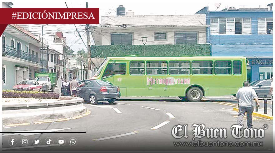 Orizaba.- La tarde del lunes se registró un accidente vial en la conocida “rotonda de la muerte”, ubicada en la esquina de Sur 10, donde un vehículo particular y un autobús de la línea Metropolitano se vieron involucrados.