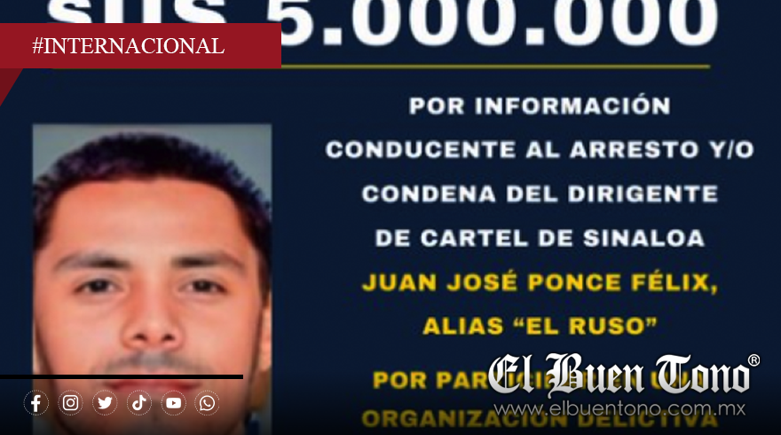 Los Ángeles, California. — La Administración para el Control de Drogas (DEA) anunció una recompensa de 5 millones de dólares por información que lleve a la captura de Juan José Ponce Félix, alias “El Ruso”, considerado uno de los principales operadores armados del Cártel de Sinaloa, específicamente del grupo “La Mayiza”, leal a Ismael “El Mayo” Zambada.
