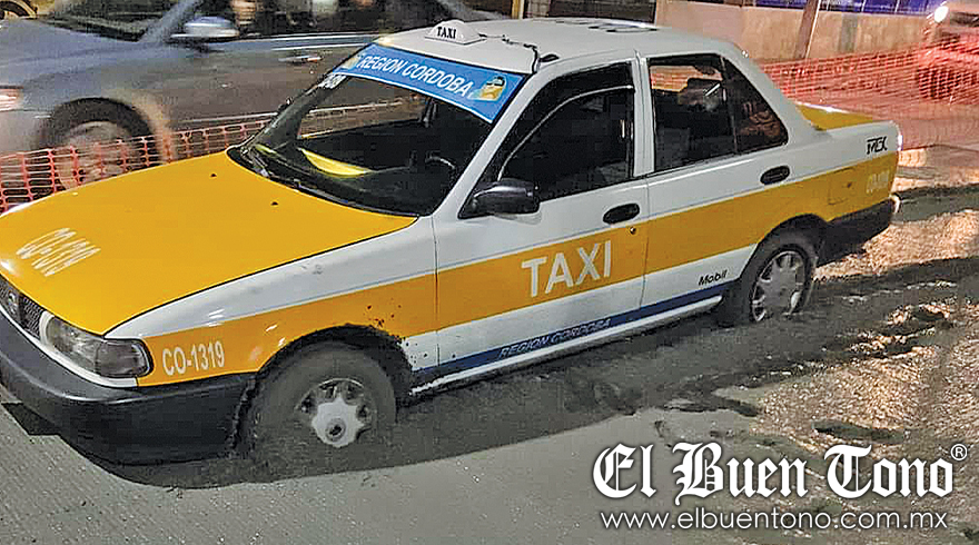Córdoba.- Ante la falta de una buena señalización por parte de trabajadores de Obras Públicas se registró un accidente la noche de este sábado, en la avenida 4 y calle 33 de la colonia Rodríguez Clara, lugar por donde circulaba el conductor del taxi 1319, quien no se percató de que acababan de colar un tramo de pavimento porque no estaba cercado de manera correcta, quedando el vehículo atorado en el cemento fresco.