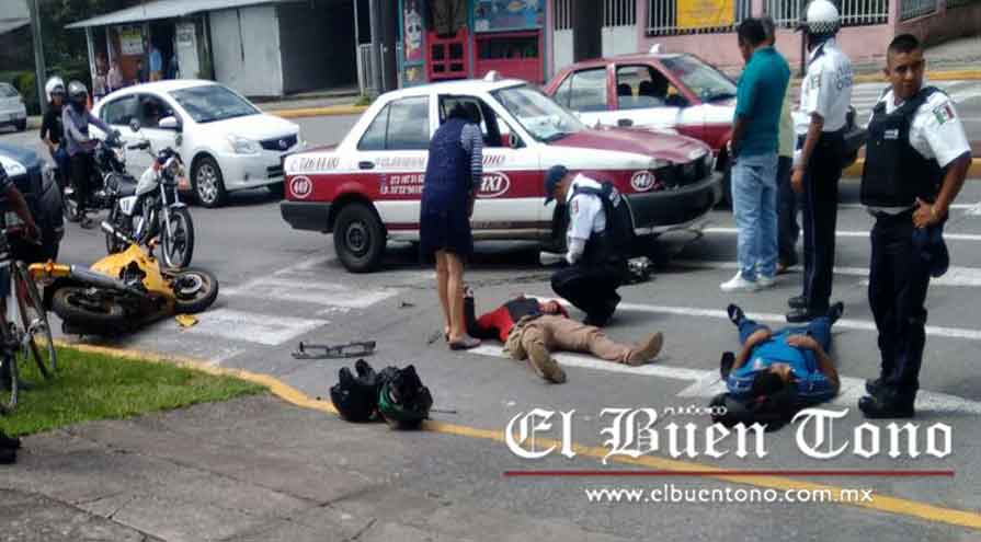 Orizaba.- Un choque, protagonizado por una motocicleta y un taxi —en la entrada de la Unidad Habitacional Fovissste y avenida Circunvalación— se registró la mañana de ayer; dos personas resultaron lesionadas.