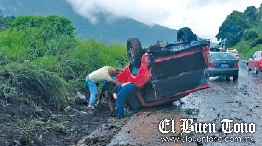 El segundo accidente ocurrió en Nogales, a la altura del entronque de La Choza, cuando un hombre que viajaba a bordo de una camioneta color rojo, se salió del camino y la unidad acabó volcada llantas arriba dentro de la cuneta que está a un costado de la autopista.