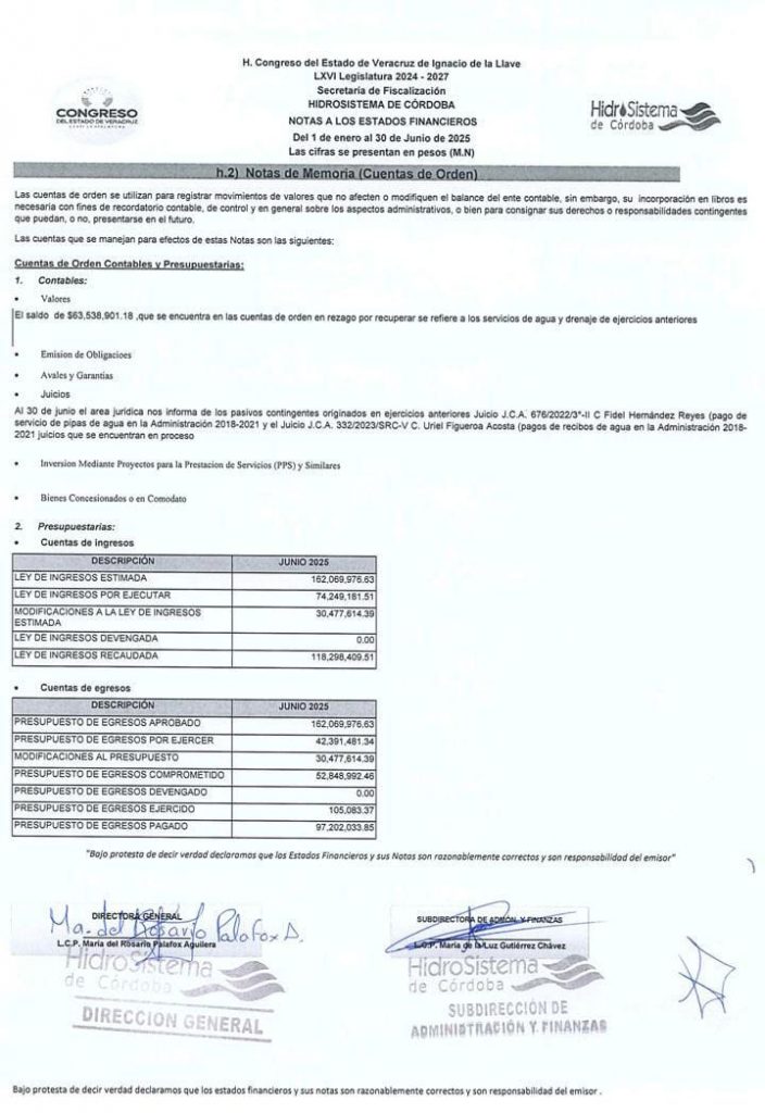 El documento presentado ante el Congreso del Estado es claro en el diagnóstico del problema, pero omiso en la solución real. En las “Notas de Memoria (Cuentas de Orden)”, se establece que existe un “saldo de $63,538,901.18 que se encuentra en las cuentas de orden en rezago por recuperar se refiere a los servicios de agua y drenaje de ejercicios anteriores”.