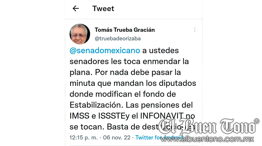 Orizaba.- A los senadores les corresponde hacer lo correcto, debido a que por nada debe pasar la minuta que mandan los diputados donde modifican el fondo de estabilización, manifestó el ex alcalde de Orizaba y ex diputado, Tomás Trueba Gracián.