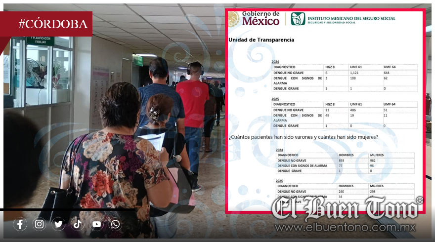 De acuerdo con la respuesta a una solicitud de transparencia, en 2024 se registraron mil 121 diagnósticos de dengue en la Unidad de Medicina Familiar (UMF) No. 61 y 644 en la UMF No. 64, ambas en Córdoba. Además, se reportaron casos con signos de alarma y dengue grave en el Hospital General de Zona (HGZ) No. 8 de la misma localidad. Para 2025, aunque las cifras muestran una disminución, la tendencia se mantiene: La UMF 61 atendió 486 casos y la UMF 64 registró 51 tan solo en los primeros ocho meses del año.