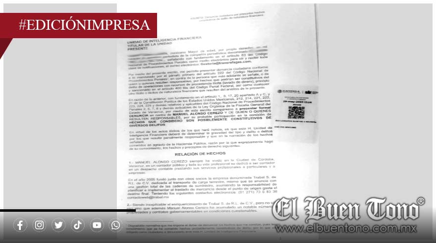 La denuncia documenta cómo el impugnado habría utilizado la empresa Trabal S. de R.L. de C.V. para ocultar el origen de millones de pesos, adquirir propiedades y obtener contratos gubernamentales en condiciones sospechosas. El expediente fue sellado de recibido este 29 de mayo a las 13:26 horas por la Secretaría de Hacienda.