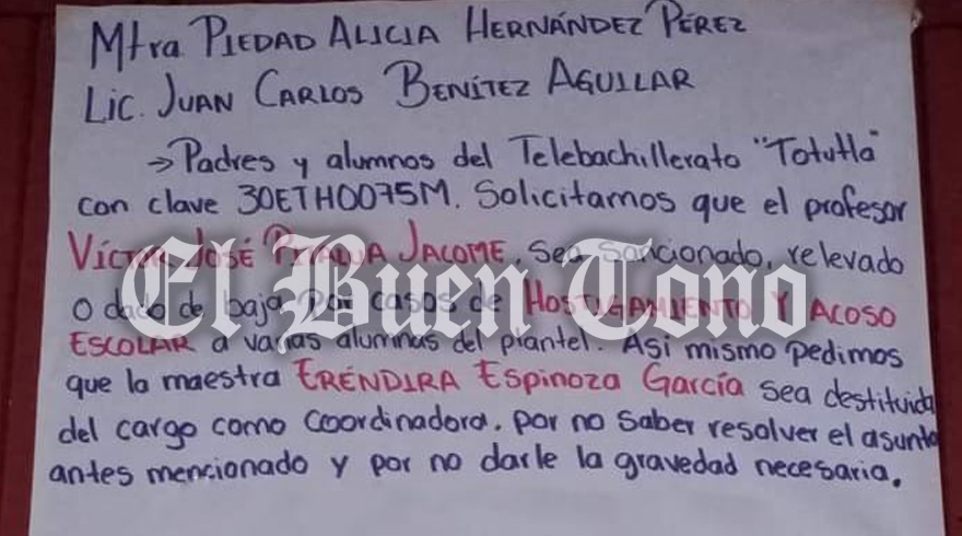 Totutla.- Padres y estudiantes tomaron las instalaciones del telebachillerato, para exigir la destitución de un profesor por presunto acoso y hostigamiento hacia las alumnas.