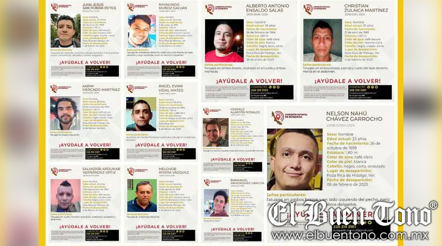 A través de un collage se muestran 11 casos, todos los desaparecidos son hombres entre las edades de 27 a 44 años de edad a quienes les perdieron la pista entre el 18 de enero y 16 de febrero de este 2023. La cantidad de casos en un corto tiempo ha sorprendido a los ciudadanos de esa región petrolera.