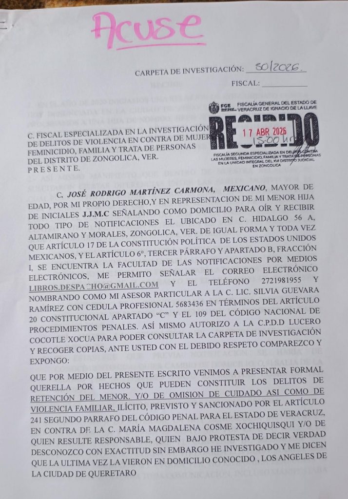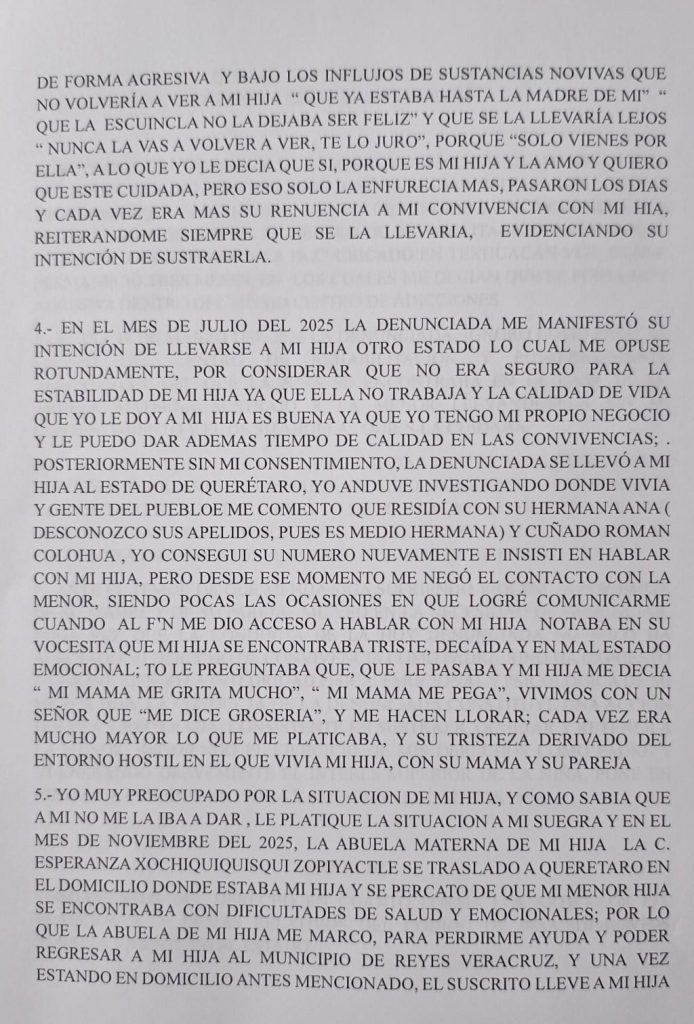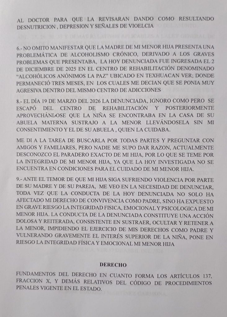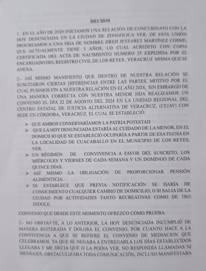 De acuerdo con el documento, el denunciante, identificado como el padre de la menor, señaló que los hechos se originaron tras la disolución de una relación de concubinato en 2024, periodo en el que ambas partes habrían establecido acuerdos legales sobre la custodia, convivencia y manutención de su hija.