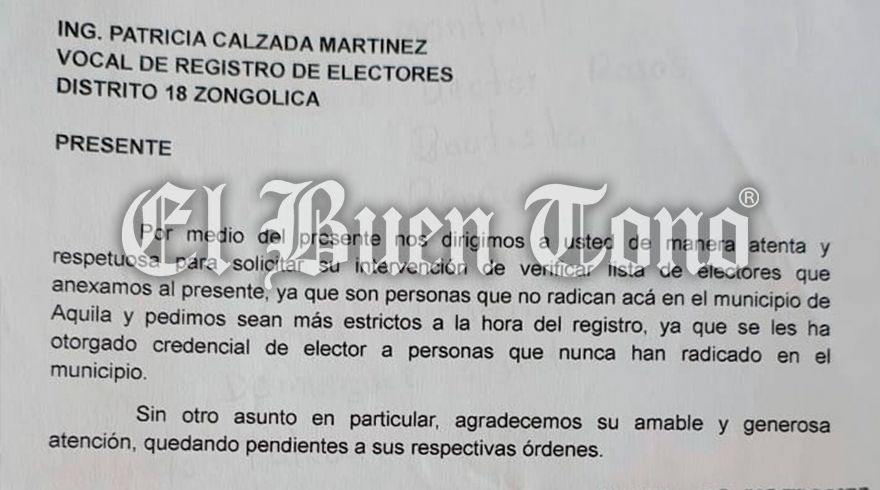 Orizaba.- El 2 de agosto de 2024, ciudadanos de Aquila solicitaron la intervención de Patricia Calzada Martínez, vocal del Registro Federal de Electores del Instituto Nacional Electoral (INE) del Distrito 18 con cabecera en Zongolica, para verificar la lista de electores. Entregaron una lista de personas que, según afirman, son originarias de Maltrata y no residen en Aquila, pero que han sido registradas como votantes en este municipio.