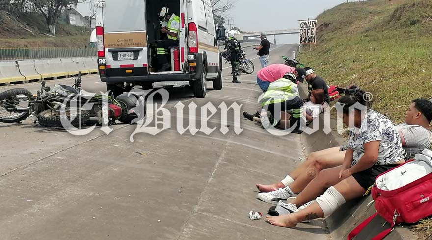 Amatlán, Ver.- Dos jóvenes que viajaban en motocicleta resultaron con algunos golpes al derrapar este lunes por la tarde, a la altura del kilómetro 296 de la autopista Córdoba-Veracruz. Paramédicos de Caminos y Puentes Federales llegaron para brindarles los primeros auxilios y valorar su estado de salud. Elementos policiacos arribaron para abanderar la circulación y evitar algún otro percance mayor.