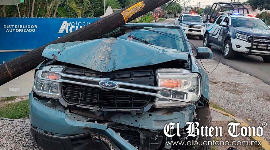 Cuitláhuac.- Una camioneta que evitó chocar contra un motociclista, quedó desbaratada al estrellarse contra un poste de telefonía, ubicado en la avenida 1, entre calles 11 y 13, el cual quedó partido a la mitad, dejando sin servicio a vecinos de la zona.