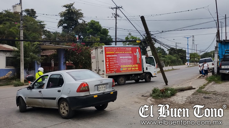 Amatlán. – Un camión de la empresa Trabal, derribó un poste de madera que sostenía cables de telefonía, al circular sobre la carretera estatal a Amatlán.