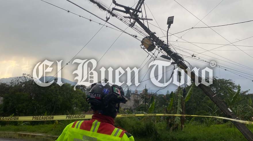 Fortín. – Las fuertes rachas de viento registradas esta tarde, derribaron dos postes de concreto que sostenían cables de media y alta tensión en el fraccionamiento Los Encinos.