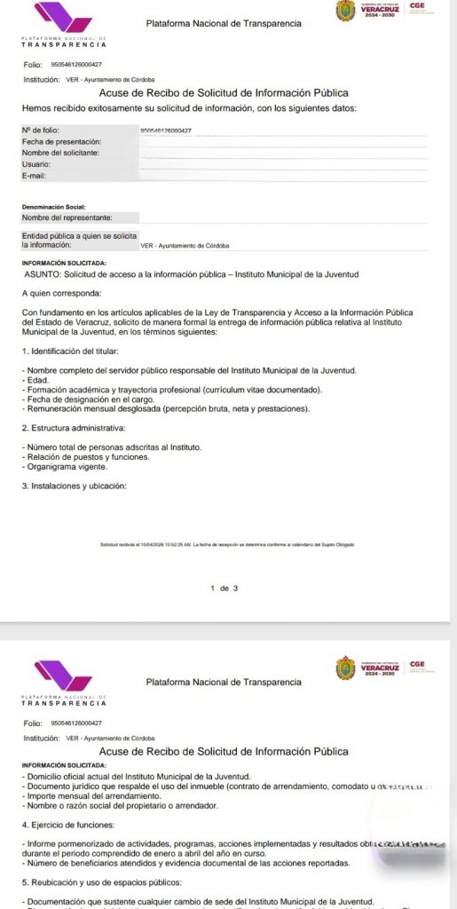 Córdoba, Ver.- La administración encabezada por Manuel Alonso Cerezo enfrenta nuevos cuestionamientos luego de que se promoviera una solicitud de acceso a la información dirigida al Ayuntamiento de Córdoba para esclarecer el manejo del Instituto Municipal de la Juventud, incluyendo nombre del titular, salario, edad, perfil profesional, número de personas adscritas, ubicación de oficinas, contrato de arrendamiento, identidad del propietario y un informe de actividades de enero a abril. La exigencia surge en medio de señalamientos por la asignación de un inmueble amplio en Plaza Jardín a un área que opera con estructura mínima y sin resultados visibles, lo que evidencia un uso desproporcionado de recursos públicos.