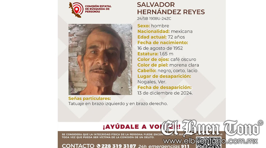 Se trata de Salvador Hernández Reyes, de 72 años de edad, quien tiene 1.65 m de estatura, ojos café oscuro, piel morena clara, cabello negro corto lacio, y como señas particulares tiene tatuajes en ambos brazos.