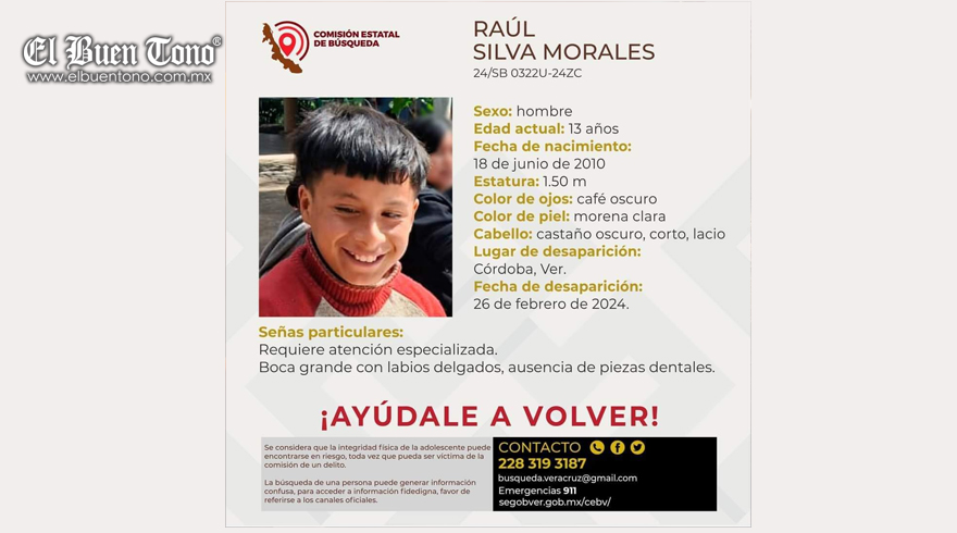 Córdoba. – Familiares del adolescente Raúl Silva Morales, de 13 años, pidieron el apoyo de la ciudadanía para localizarlo, el desapareció el pasado 26 de febrero en Córdoba y hasta el momento nada saben de su paradero.