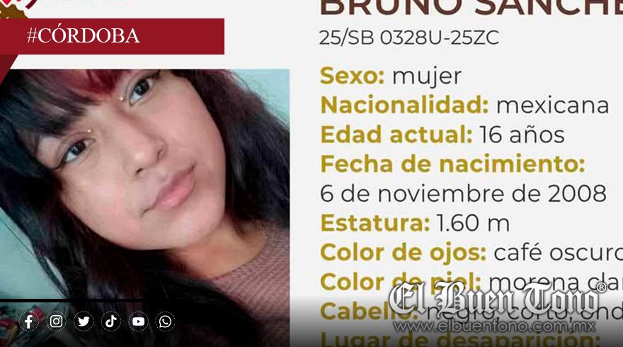 Córdoba.- La Comisión Estatal de Búsqueda emitió un boletín de emergencia, por la desaparición de la adolescente Azucena Bruno Sánchez, de 16 años, quien fue vista por última vez el pasado 4 de marzo en Córdoba.