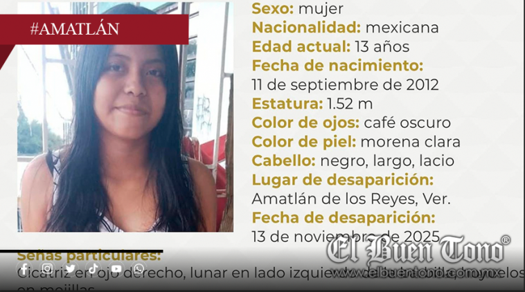 Amatlán de los Reyes, Ver.– Dulce María Carrera Ramírez, de 13 años, fue reportada como desaparecida desde el jueves 13 de noviembre. Su familia solicita el apoyo de autoridades y ciudadanos para localizarla sana y salva.