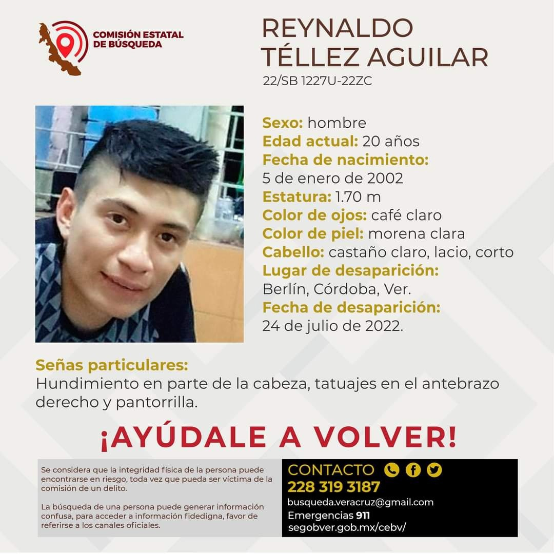 Córdoba.- Un joven identificado como Reynaldo Téllez Aguilar, de 20 años de edad, el cual desapareció durante la mañana del pasado domingo tras salir de su domicilio en la comunidad de Berlín, es reportado como desaparecido, debido a que familiares al no saber nada de él, tuvieron que acudir ante la Fiscalía Regional para presentar la denuncia por su desaparición y ser buscado a través de la Comisión Estatal de búsqueda de personas, debido a que temen algo malo le haya ocurrido.
