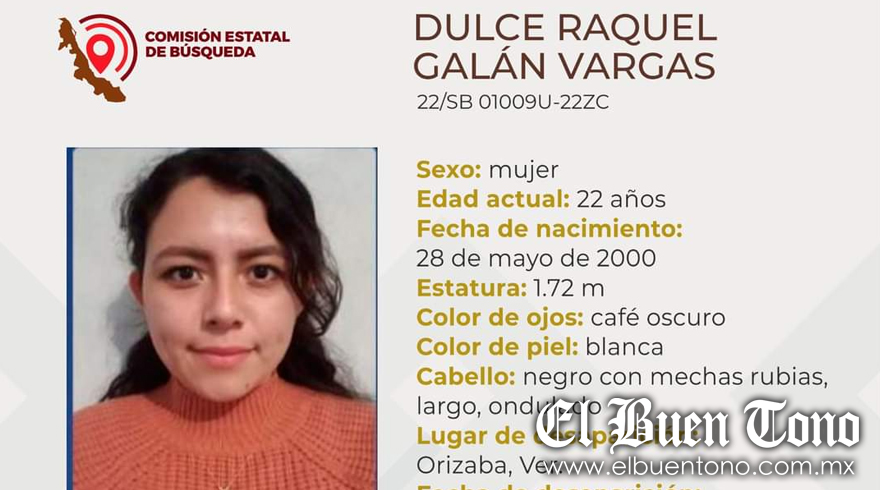Córdoba.- Dulce Raquel Galán Vargas, de 22 años de edad, con domicilio en la colonia la Luz Palotal, es reportada como desaparecida y buscada a través de la Comisión Estatal de Búsqueda de Personas Desaparecidas, debido a que sus familiares indican desapareció en el municipio de Orizaba durante la mañana del viernes y hasta el momento no han vuelto a saber nada de ella.