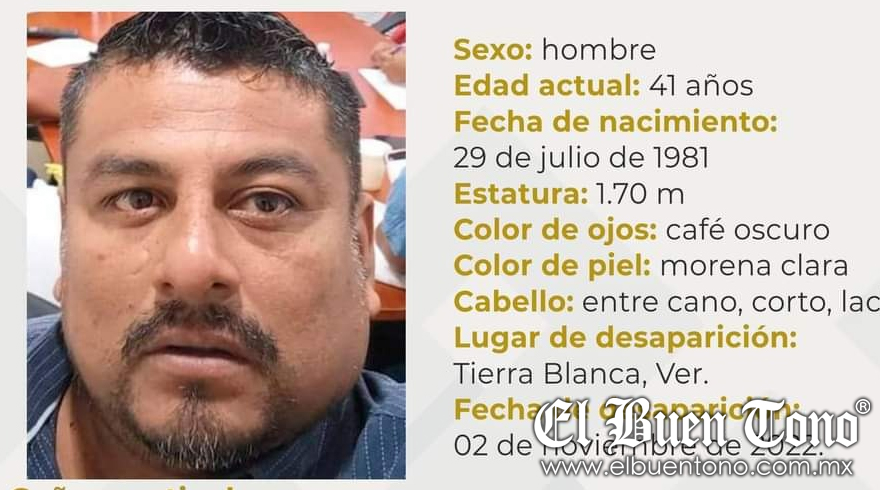 Tierra Blanca, Ver.- Un hombre de 41 años de edad, se encuentra como desaparecido desde el pasado 2 de noviembre en esta localidad. La Comisión de Búsqueda de personas desaparecidas ya emitió su alerta a las diferentes corporaciones para tratar de localizarlo sano y salvo. Como seña particular tiene un tatuaje en el brazo derecho.