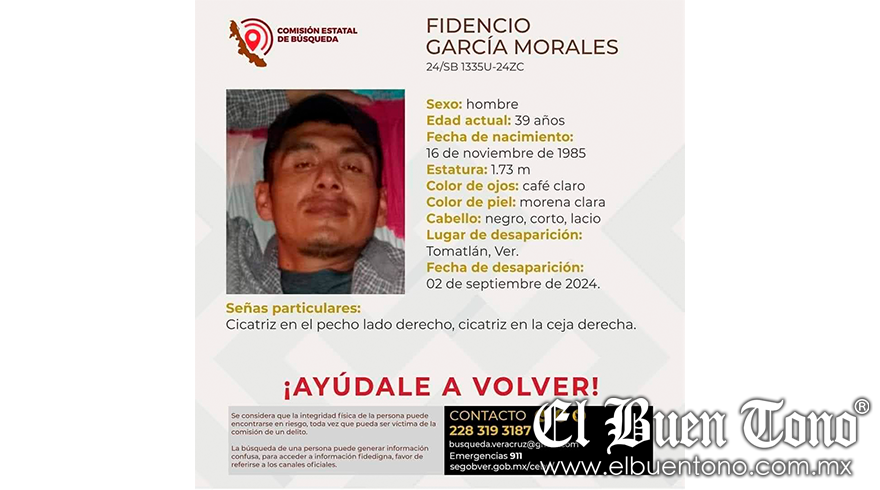Tomatlán.- Un hombre identificado como Fidencio García Morales, de 39 años, fue reportado como desaparecido desde el pasado lunes 2 de septiembre, cuando fue visto por última vez en Tomatlán.