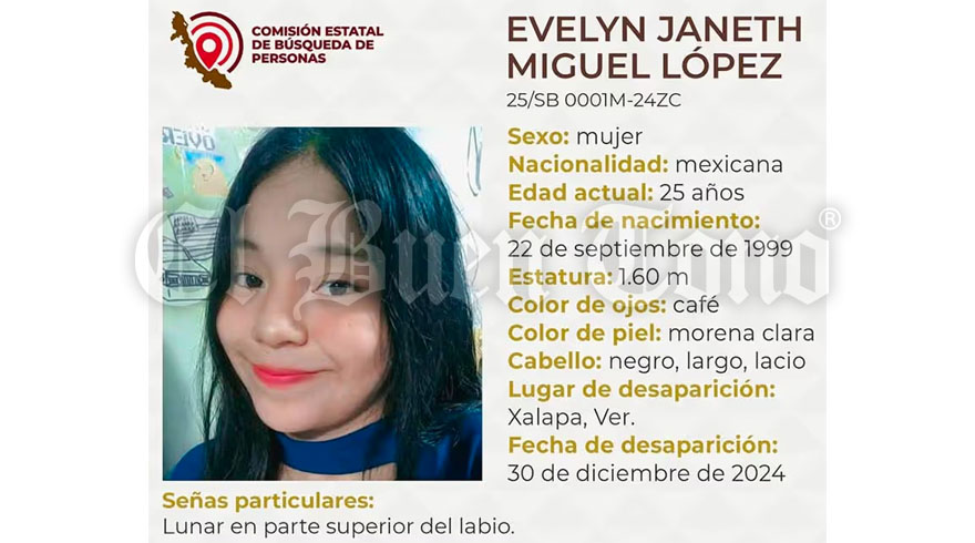 Xalapa, Veracruz.- Evelyn Janeth Miguel López, de 25 años, fue reportada como desaparecida en la ciudad de Xalapa desde el pasado 30 de diciembre. Hasta la fecha, sigue activa la ficha de localización emitida por la Comisión Estatal de Búsqueda para dar con su paradero.