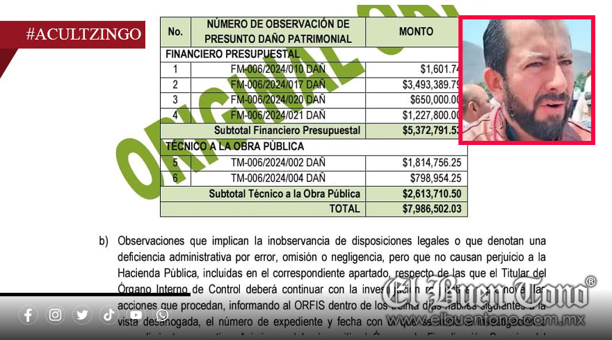 Acultzingo, Ver.- La administración del presidente municipal Luis Alfredo Cruz López quedó exhibida por el Órgano de Fiscalización Superior del Estado de Veracruz (ORFIS) tras detectarse un descomunal daño patrimonial por más de 7 millones 986 mil pesos durante el ejercicio fiscal 2024, lo que confirma el nivel de corrupción, cinismo y saqueo con que este personaje ha gobernado.