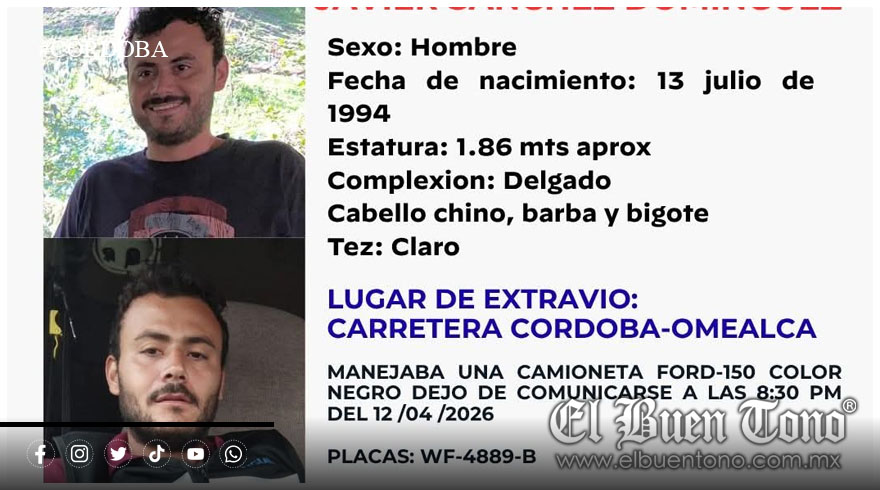 Yanga, Ver.- Familiares de Javier Sánchez Domínguez, de 31 años, pidieron el apoyo de la ciudadanía para localizarlo. El fue visto por última vez alrededor de las 20:30 horas del domingo 12 de abril sobre la carretera Córdoba–Omealca, donde se desplazaba abordo de su camioneta Ford F-150, negra, con placas WF-4889-B.