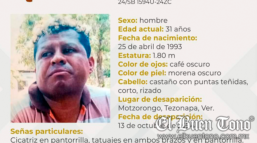 Tezonapa.- Un hombre de nombre Enrique de la Cruz Morán, de 31 años, fue reportado como desaparecido desde el 13 de octubre de este año en Motzorongo.