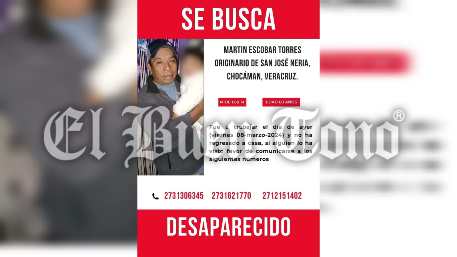 Chocamán. – Familiares del señor Martín Escobar Torres, originario de San José Neria, pidieron el apoyo de la ciudadanía para localizarlo. Él desapareció el viernes, cuando salió de su casa para ir a trabajar, pero hasta ahora nada saben de su paradero.