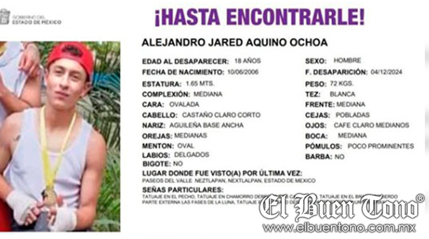 México.-Alejandro Jared Aquino Ochoa, un joven de 18 años, fue reportado como desaparecido el 4 de diciembre tras intentar salvar a un perro que había caído en un canal de aguas negras en Paseos del Valle Nextlalpan, en el Estado de México. El joven, quien había avisado a su familia que iba al rescate del animal, dejó de dar señales de vida y no regresó a casa, lo que motivó a sus familiares y amigos a iniciar su búsqueda. Ante la falta de respuestas, se emitió una ficha de búsqueda para dar con su paradero.