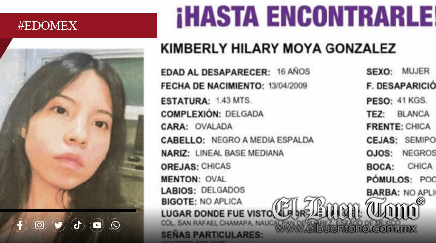 Naucalpan, Edo. Méx.- Kimberly Hilary Moya González, estudiante del CCH Naucalpan de 16 años, desapareció el pasado 2 de octubre luego de salir de su casa en la colonia San Rafael Chamapa para imprimir una tarea.