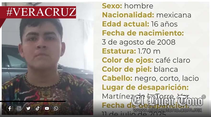 Martínez de la Torre, Ver.— La Comisión Estatal de Búsqueda de Veracruz emitió una ficha para localizar a Luis Carlos Jiménez López, un menor de 17 años de edad reportado como desaparecido en el municipio de Martínez de la Torre, al norte de la entidad.