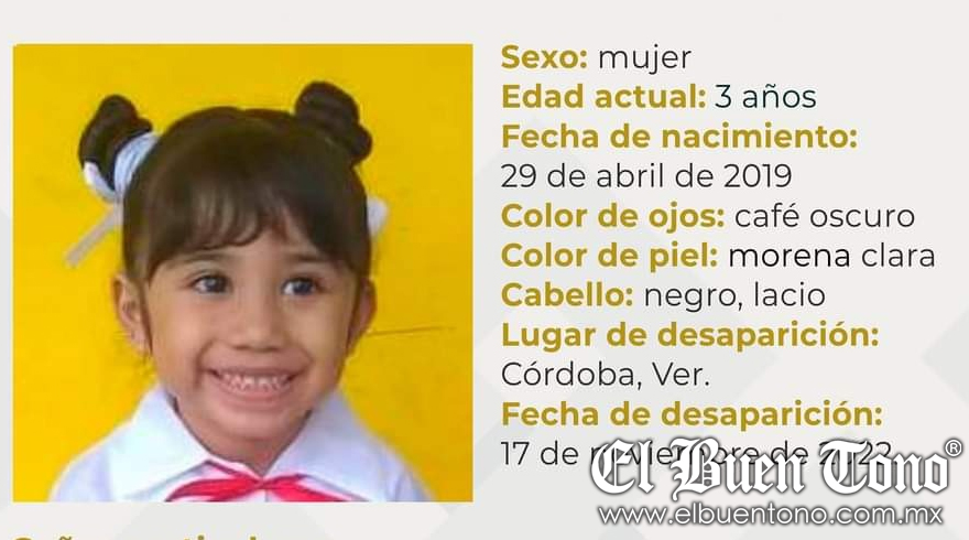 Córdoba, Ver.- Una menor de tres años de edad es reportada por la Comisión Estatal de Búsqueda de Personas Desaparecidas, como desaparecida desde el pasado 12 de noviembre.